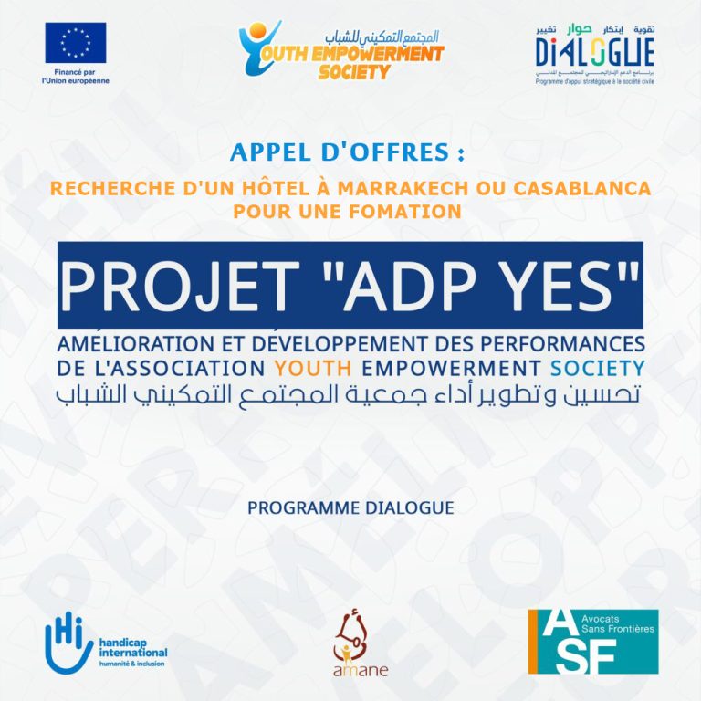 The Youth Empowerment Society (YES) Association is looking for a hosting venue in Marrakech or Casablanca for a group of 11 people, as part of its ADP YES project.